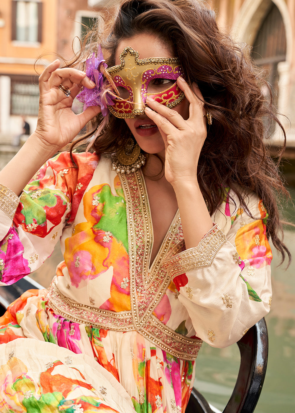Embrace timeless grace with this off-white floral printed Chinon Anarkali gown from Bindyaa, designed to radiate elegance and charm. Crafted from luxurious Chinon fabric, it features vibrant multicolor floral prints beautifully complemented by intricate zari and sequin embroidery on the neckline, cuffs, and hemline. The soft, flowy silhouette paired with a matching chiffon dupatta adds a touch of sophistication and comfort, making it ideal for Indian weddings, Pakistani festive celebrations, mehendi, haldi, and receptions. A perfect blend of modern artistry and traditional finesse, this gown captures effortless festive beauty.