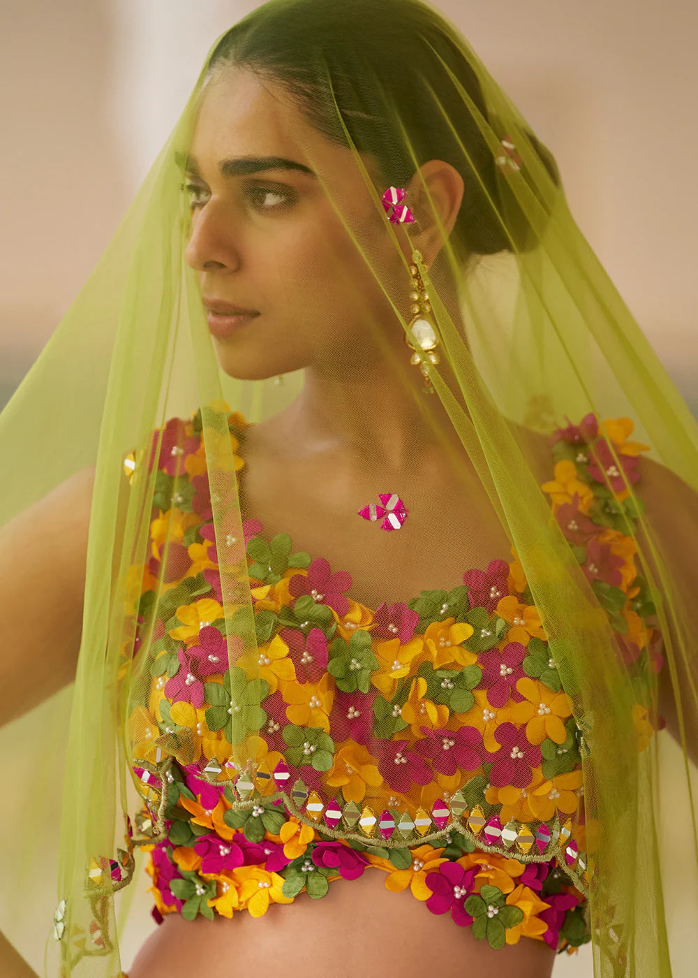Bindyaa presents a vibrant Indo Western lehenga set crafted in premium silk with a stunning blend of yellow, pink and tie-dye shades. The statement 3D floral embellished crop top paired with the multicolor lehenga creates a bold yet graceful festive look inspired by Indian, Pakistani and Punjabi fashion aesthetics.Perfect for weddings, sangeet, garba nights and grand celebrations this designer ensemble features mirror accents, handcrafted floral details and a soft flowy silhouette The lively colors and detailed embellishments bring a joyful and youthful charm to your special occasions with Bindyaa’s signature artistic styling.