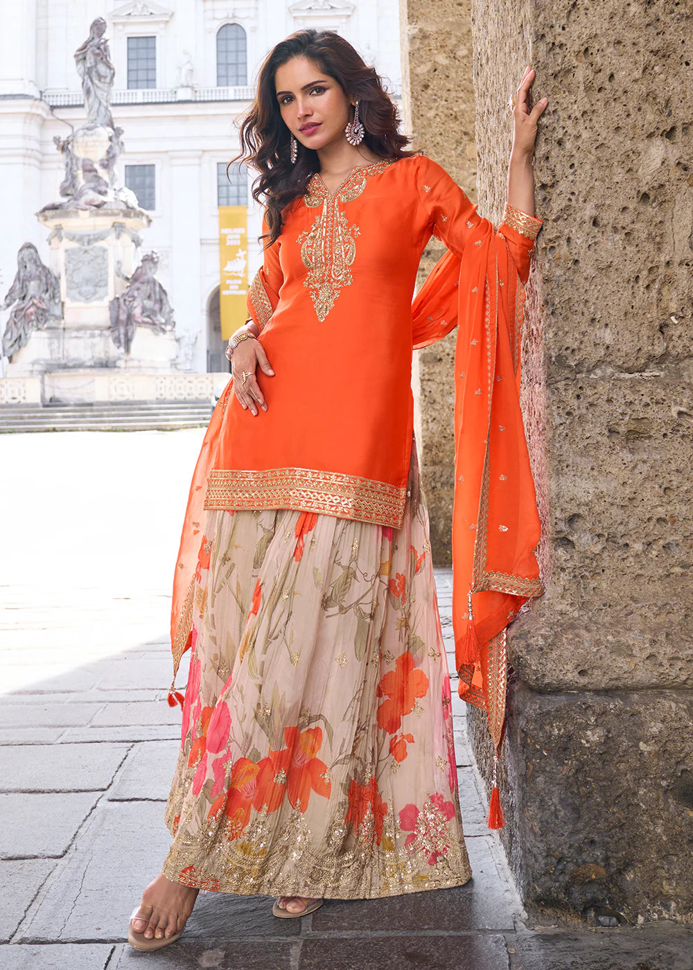 Make a statement in this Bindyaa Orange Chinon Palazzo Suit, featuring a stylish embroidered kurta paired with a floral printed palazzo and matching dupatta. Ideal for weddings, sangeet nights, Diwali celebrations, and festive gatherings.