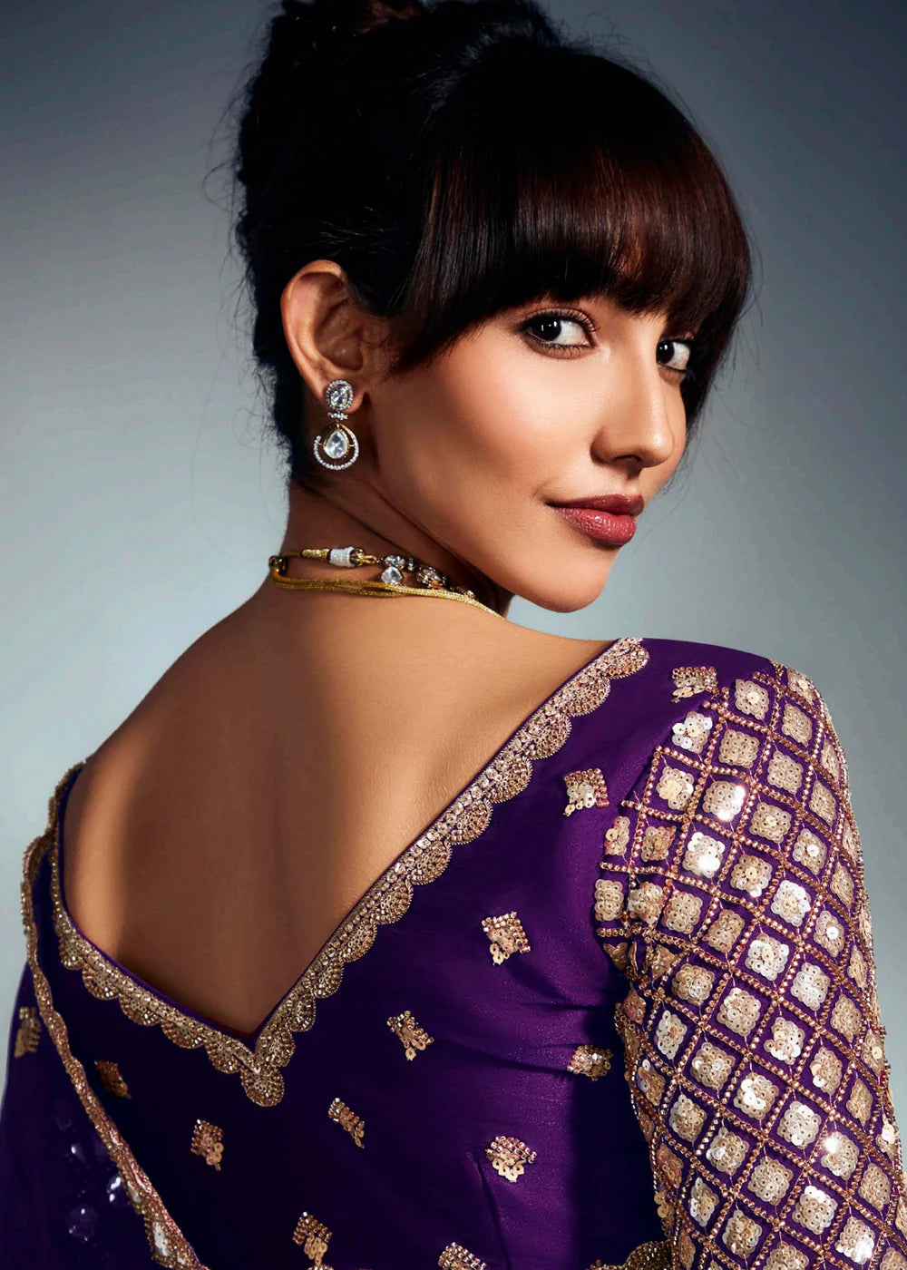 Designer Purple Organza Saree with Golden Sequin Embroidery For Indian Wedding