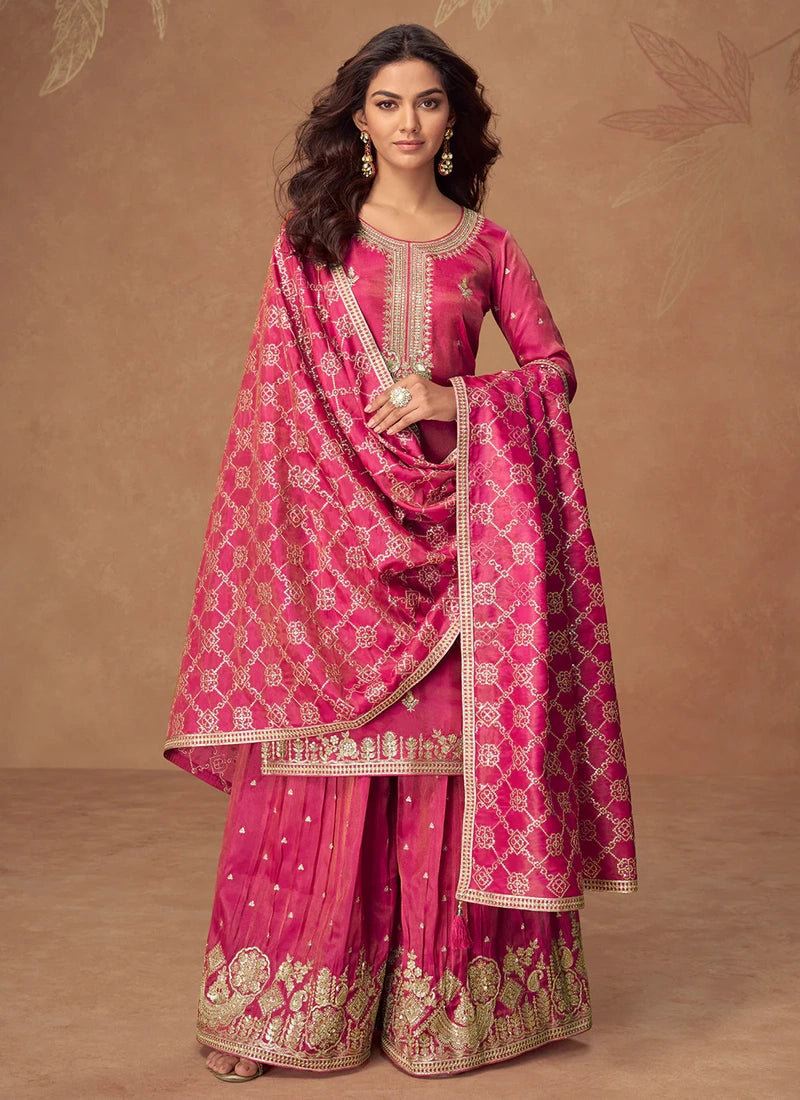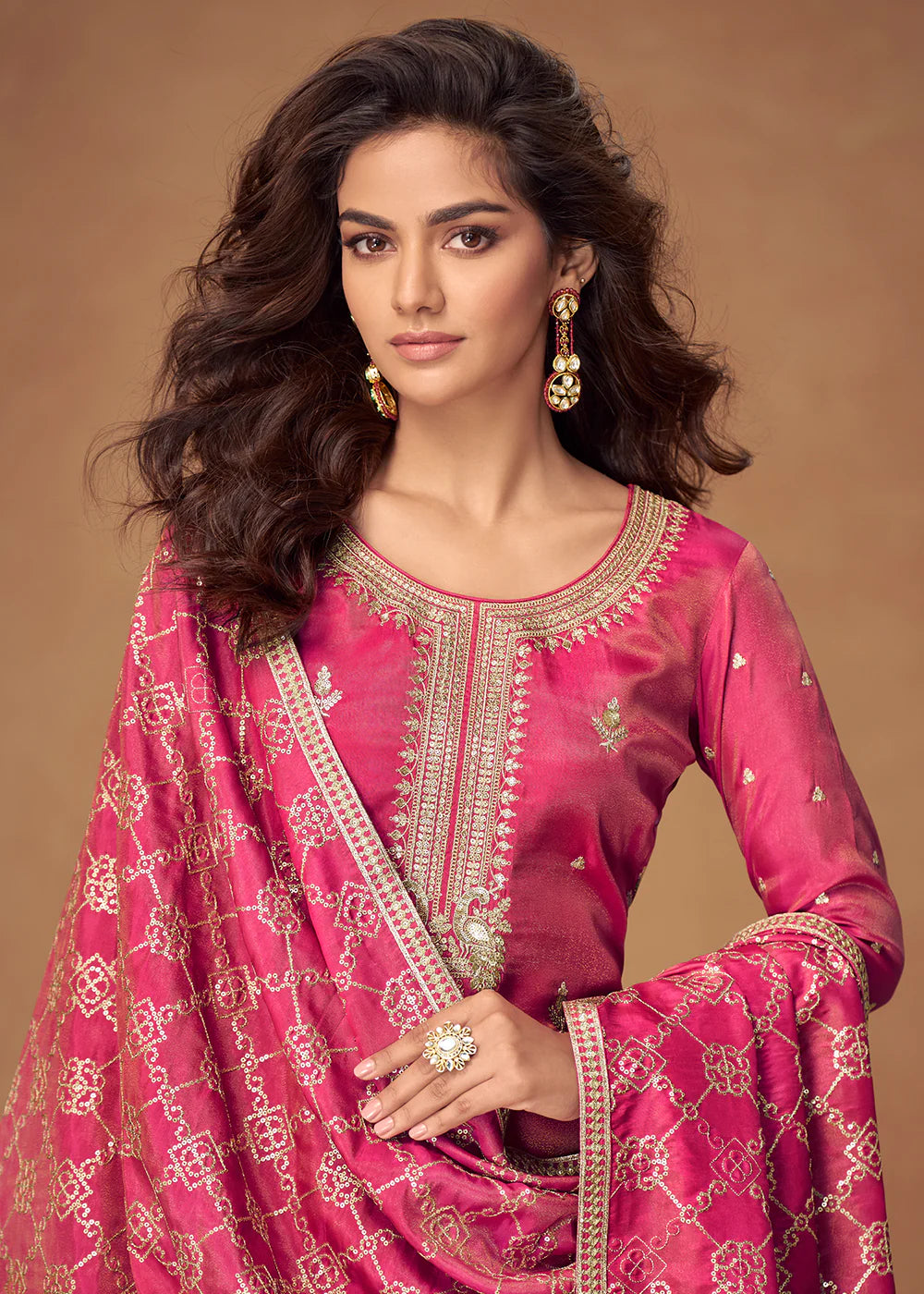 Designer Rani Pink Simar Silk Sharara Suit with Reshamkari Embroidery