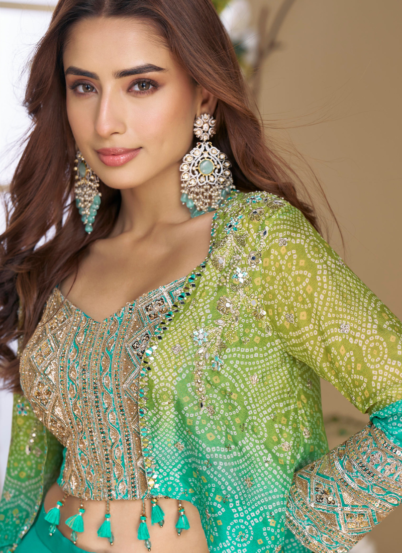 Elevate your ethnic wardrobe with this teal green Indo-Western outfit made of real chinon silk. Features a beautifully embroidered blouse and a flowy premium organza shrug, perfect for Indian weddings, Pakistani festivals, Garba, and Sangeet. Comes with custom stitching and all size options.
