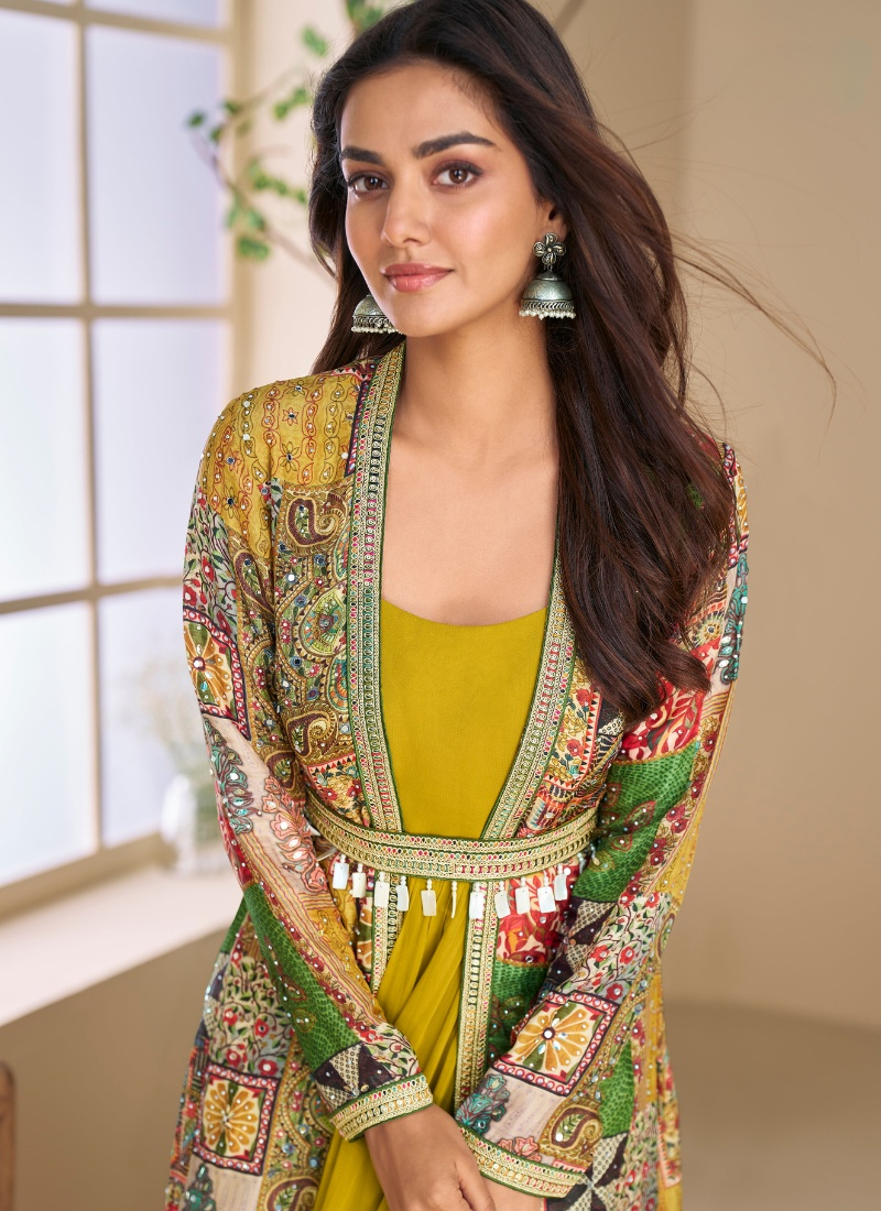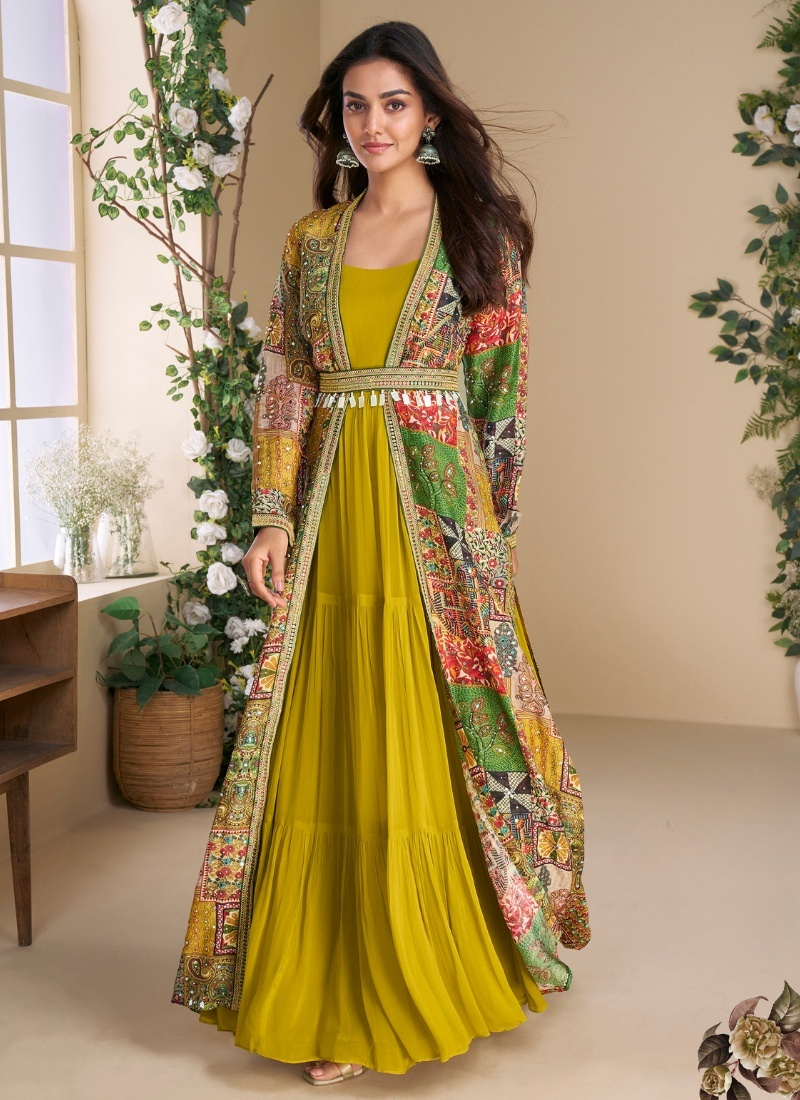 Designer Yellow Georgette Anarkali Gown with Multicolor Long Shrug