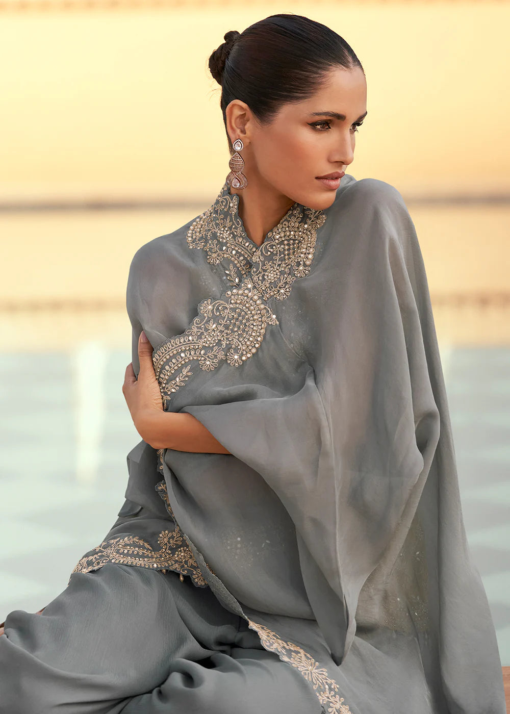 Dusty Grey and Yellow Chinon Cape Style Palazzo Suit with Embroidery