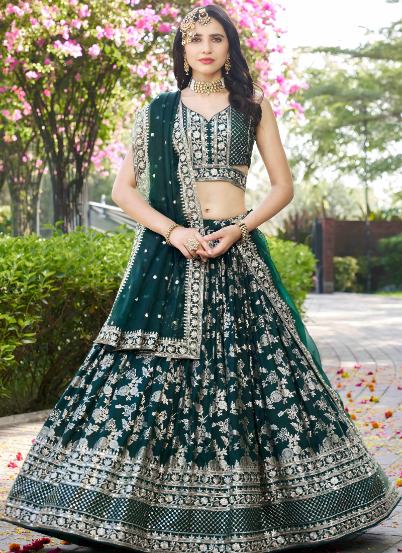 This green Dola Silk lehenga choli features delicate embroidery and a charming silhouette, perfect for Indian and Pakistani celebrations. The matching dupatta and mirror detailing make it a standout for Diwali or bridesmaids’ wear. All sizes and stitching available.