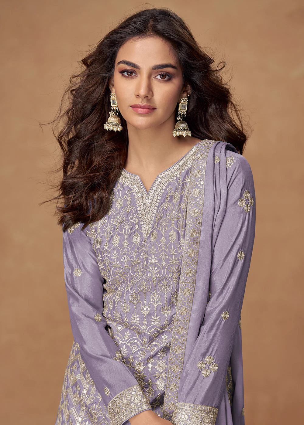 LAVENDER CHINON SILK SHARARA SUIT WITH DUPATTA FOR INDIAN FESTIVAL AND WEDDING – THREAD AND ZARI EMBROIDERY