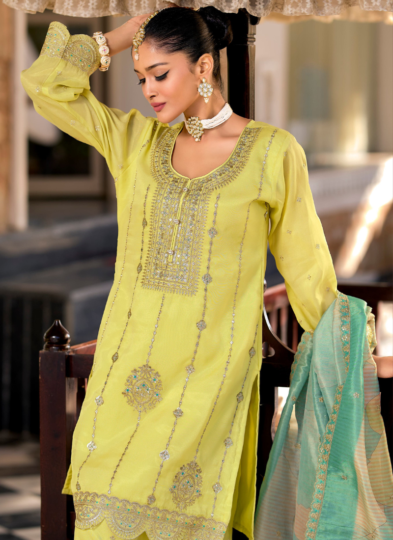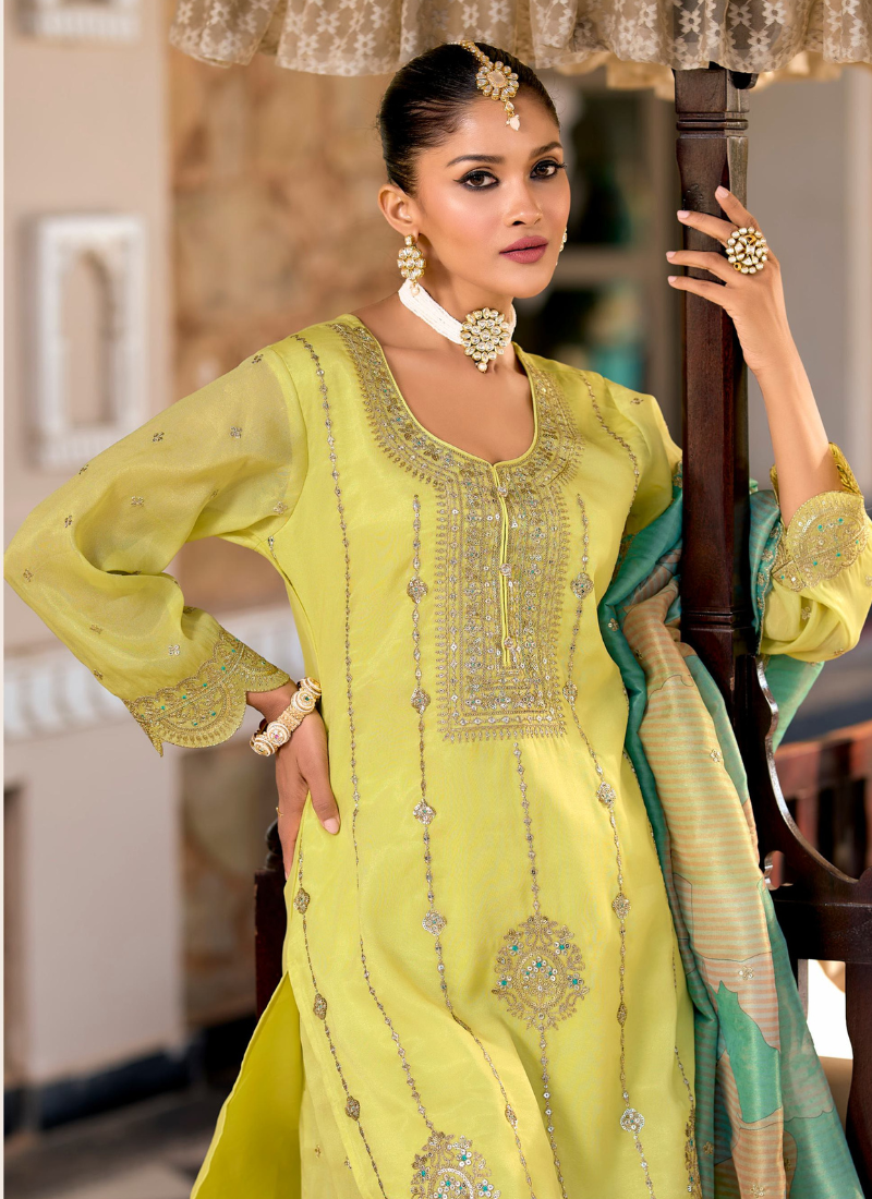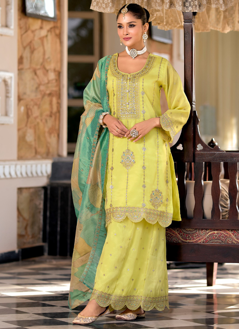 Brighten your festive wardrobe with this lime yellow embroidered sharara suit, designed to capture elegance and tradition. The intricate threadwork, delicate scallop lace, and soft dupatta in pastel green make this a graceful pick for wedding functions and cultural celebrations.