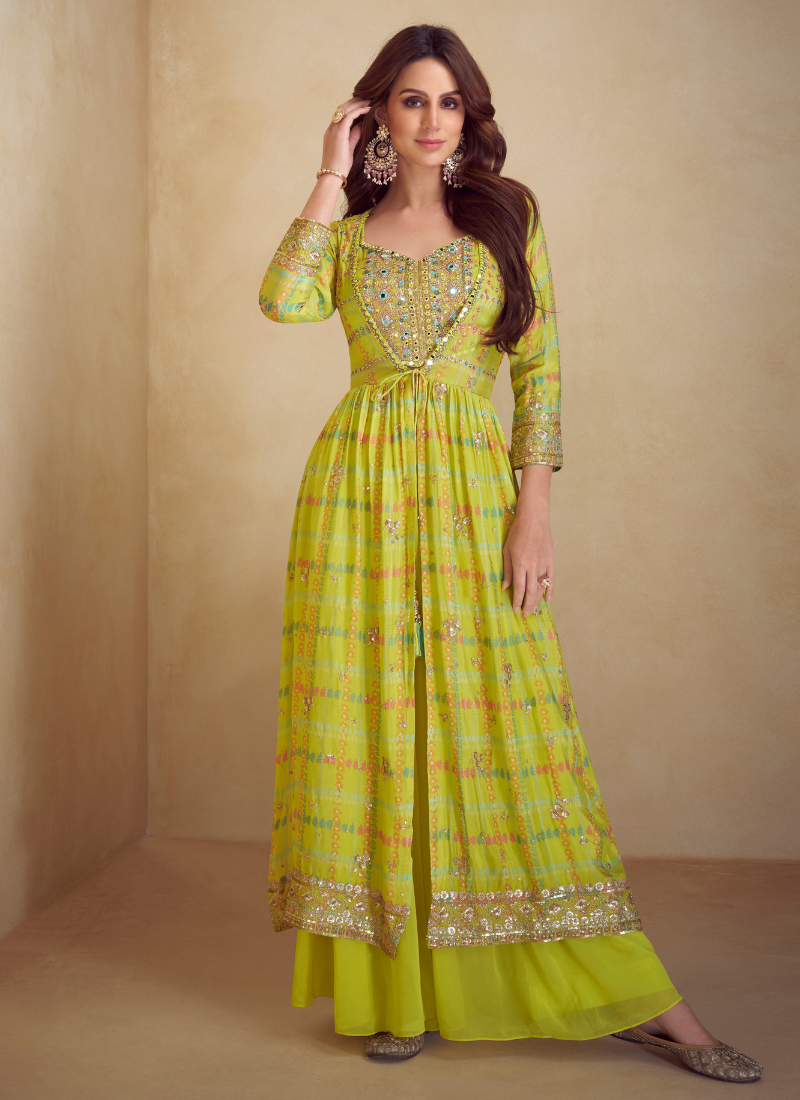 Make a bold statement in this stunning Lime Yellow Chinon Silk Sharara Set with Embroidered Blouse & Printed Shrug, Designed with shimmering sequin work on the bodice and soft sharara bottoms, this outfit is a celebration of color and craftsmanship. Perfect for wedding functions, sangeet, or receptions, the flared silhouette ensures both comfort and grace.