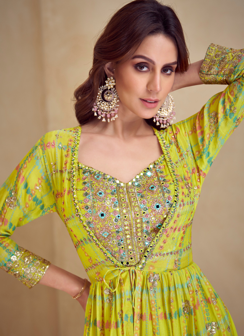 Lime Yellow Chinon Silk Sharara Set with Embroidered Blouse & Printed Shrug
