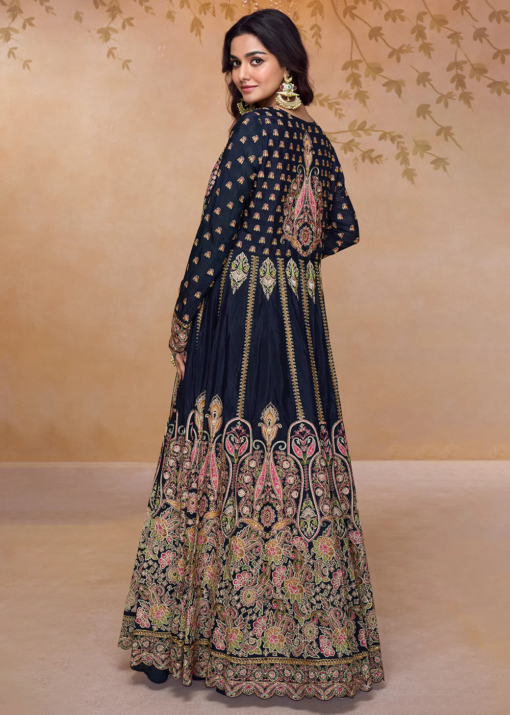 Navy Blue Georgette Lehenga Choli with Embroidered Jacket For Indian Festive & Wedding Wear