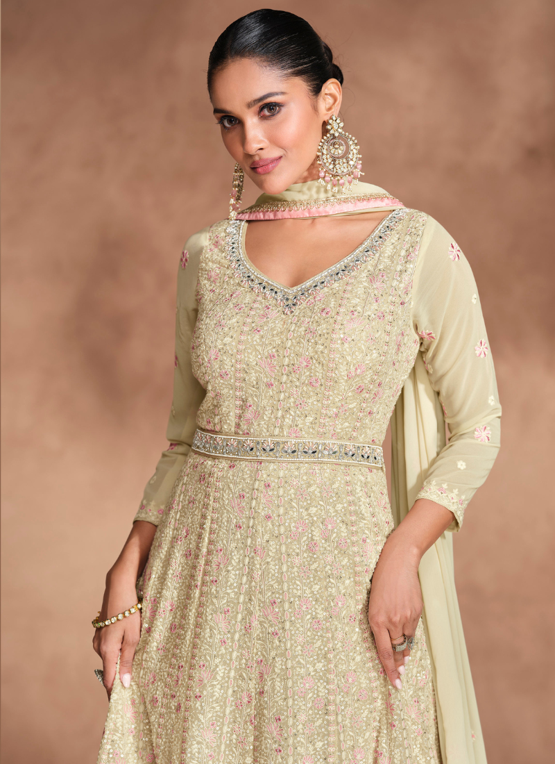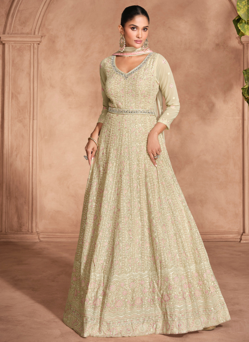 Designer Off White Anarkali gown showcases intricate chikankari embroidery paired with dupatta for a modern traditional twist. Crafted from high-quality fabric, it features elegant full sleeves and a gracefully flared silhouette, making it ideal for Indian and Pakistani weddings or festive occasions. Perfect for women and girls who love a blend of sophistication and charm.