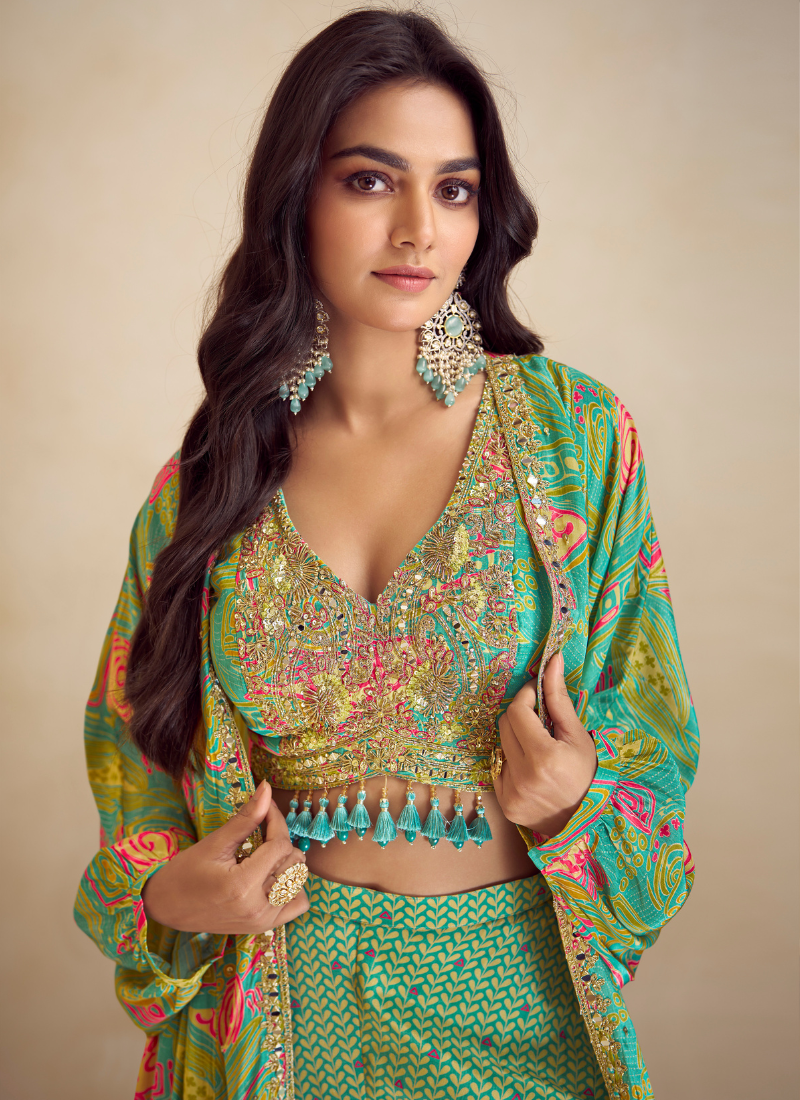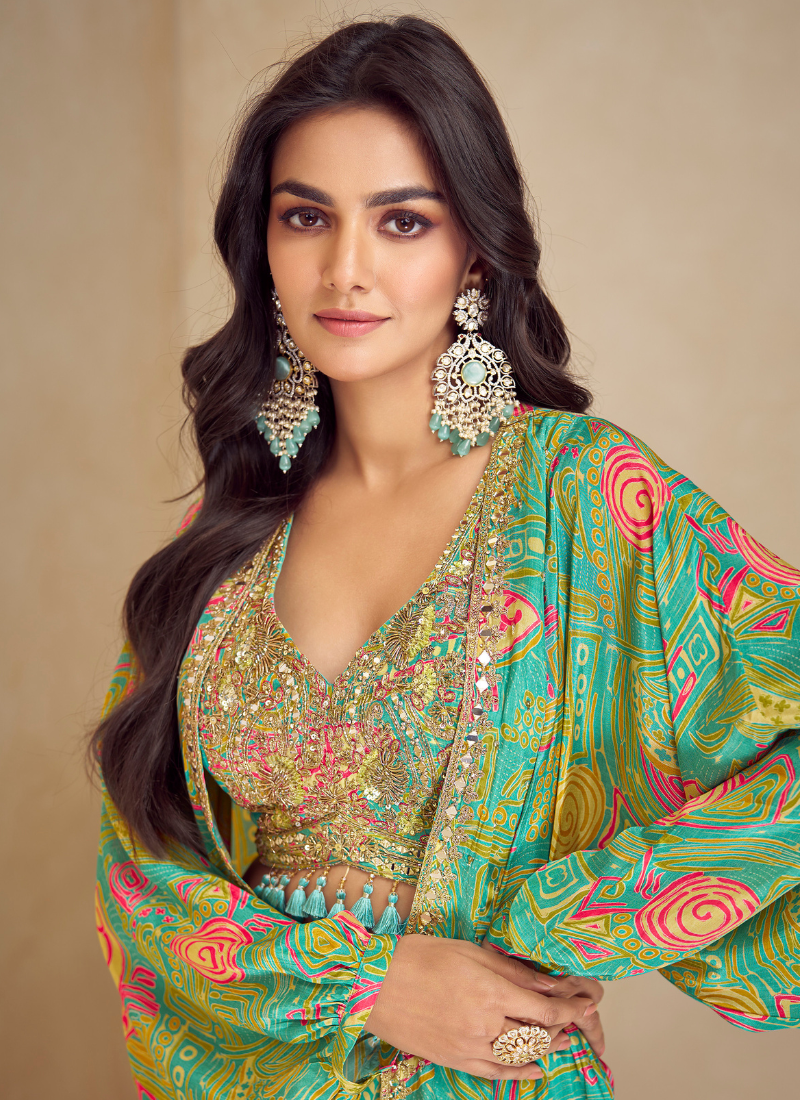Add a touch of contemporary charm with this Parrot Green Chinon Silk Palazzo Set. It includes a beautifully embellished bustier, printed palazzo, and a sheer cape-style shrug. This outfit effortlessly merges tradition with trend, making it ideal for modern festive looks and intimate weddings.