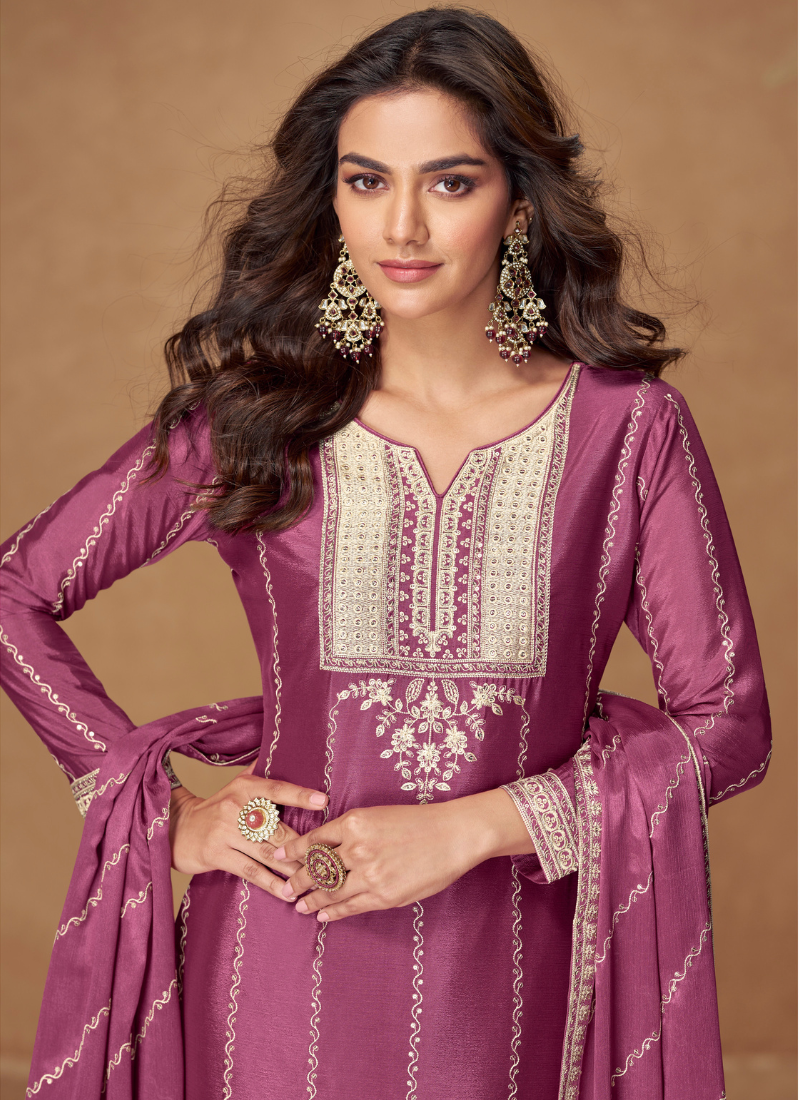 Party Wear Mauve Purple Chinon Embroidered Plazzo Suit