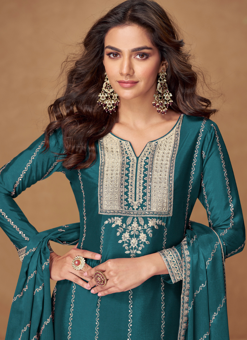 Party Wear Turquoise Chinon Embroidered Plazzo Suit