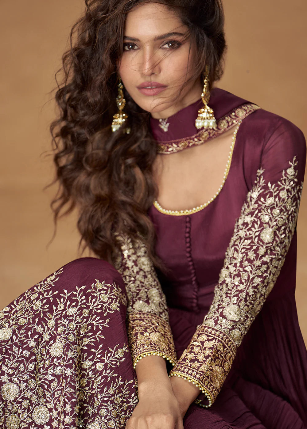This Wine Chinon Silk Anarkali Suit is the definition of sophistication. Designed with delicate floral embroidery along the bodice and hem, the outfit features a luxurious pleated flair. Ideal for receptions, evening celebrations, and festive gatherings, this gown-style suit makes a bold style statement. Includes matching dupatta with fine detailing. Custom sizes available.