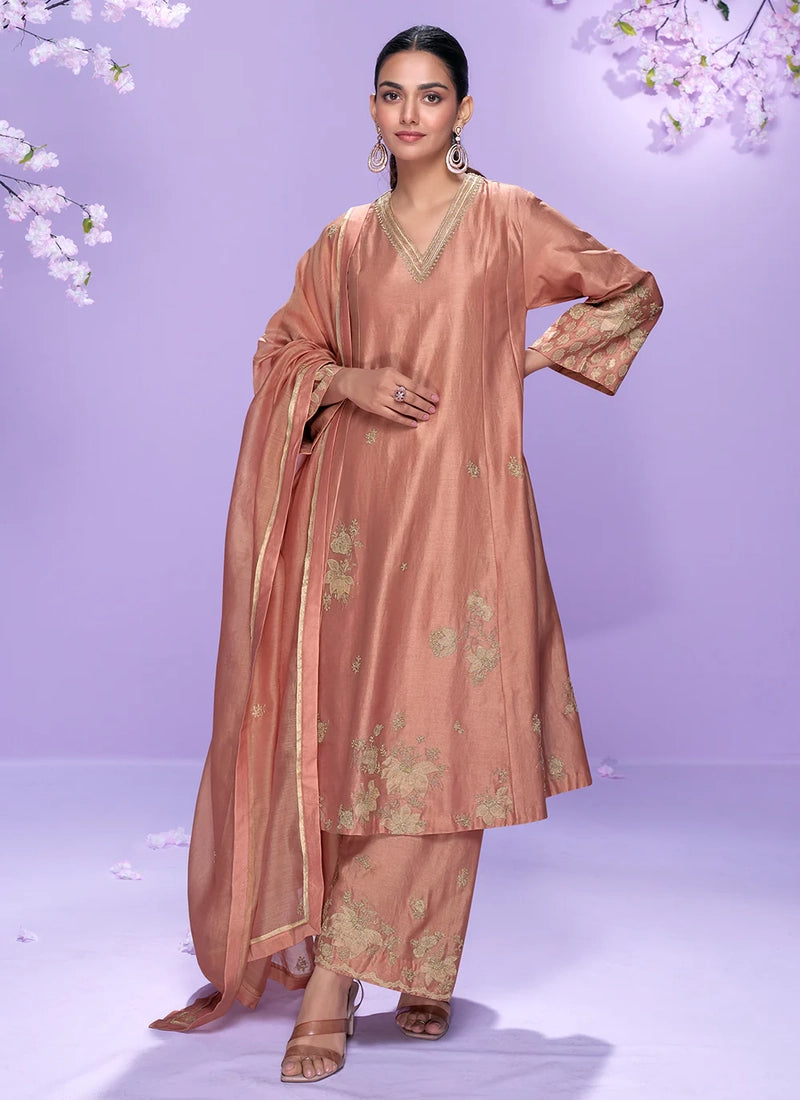 Step into understated elegance with Bindyaa’s peach Roman Silk Long Kurta Palazzo Suit. This straight-cut long kurta is adorned with subtle golden floral embroidery and paired with comfortable palazzo pants and a matching dupatta. Ideal for Indian, Pakistani, and Punjabi weddings, Diwali parties, and festive gatherings.