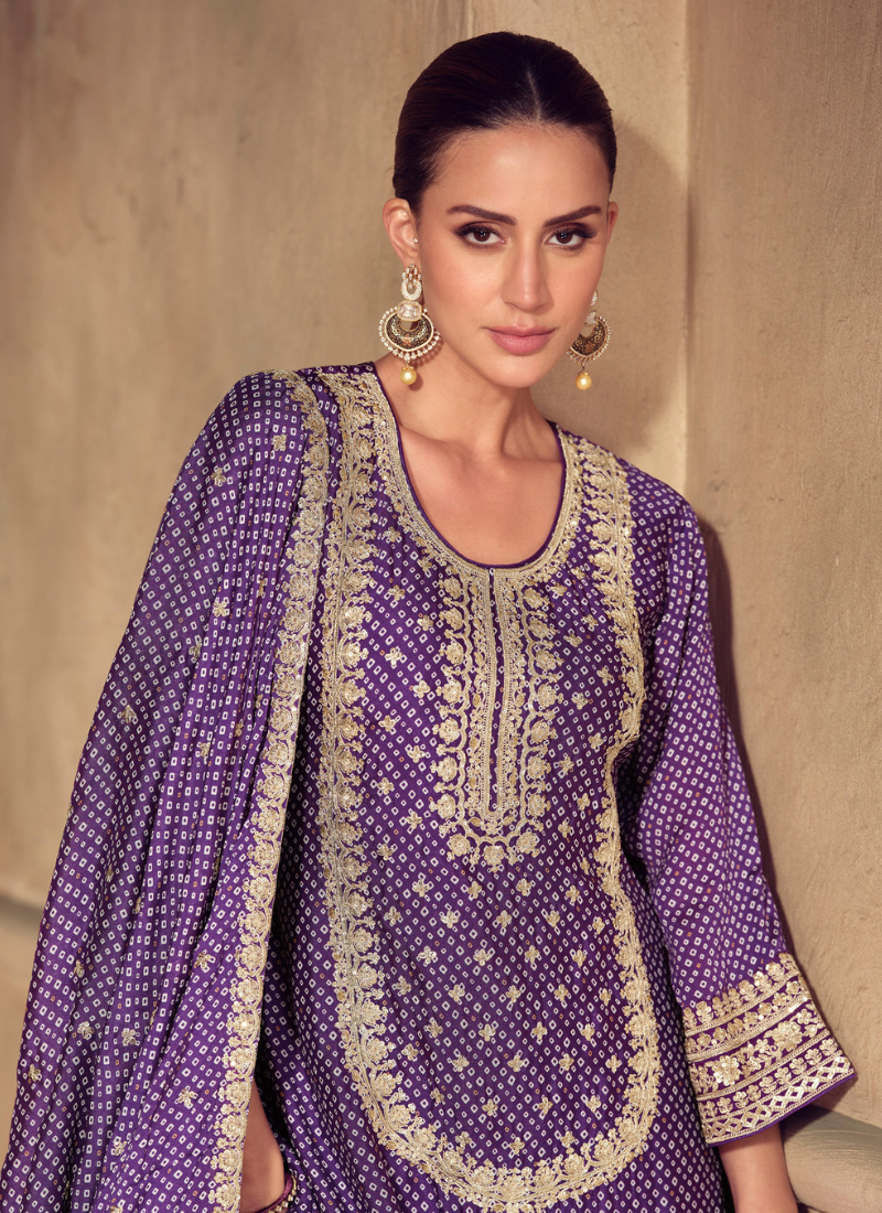 Elevate your ethnic look with this Purple Chinon Sharara Suit, featuring intricate thread embroidery, golden sequin highlights, and a flowy silhouette. Crafted for elegance, this Indian Pakistani suit is perfect for festive events, weddings, or traditional gatherings.