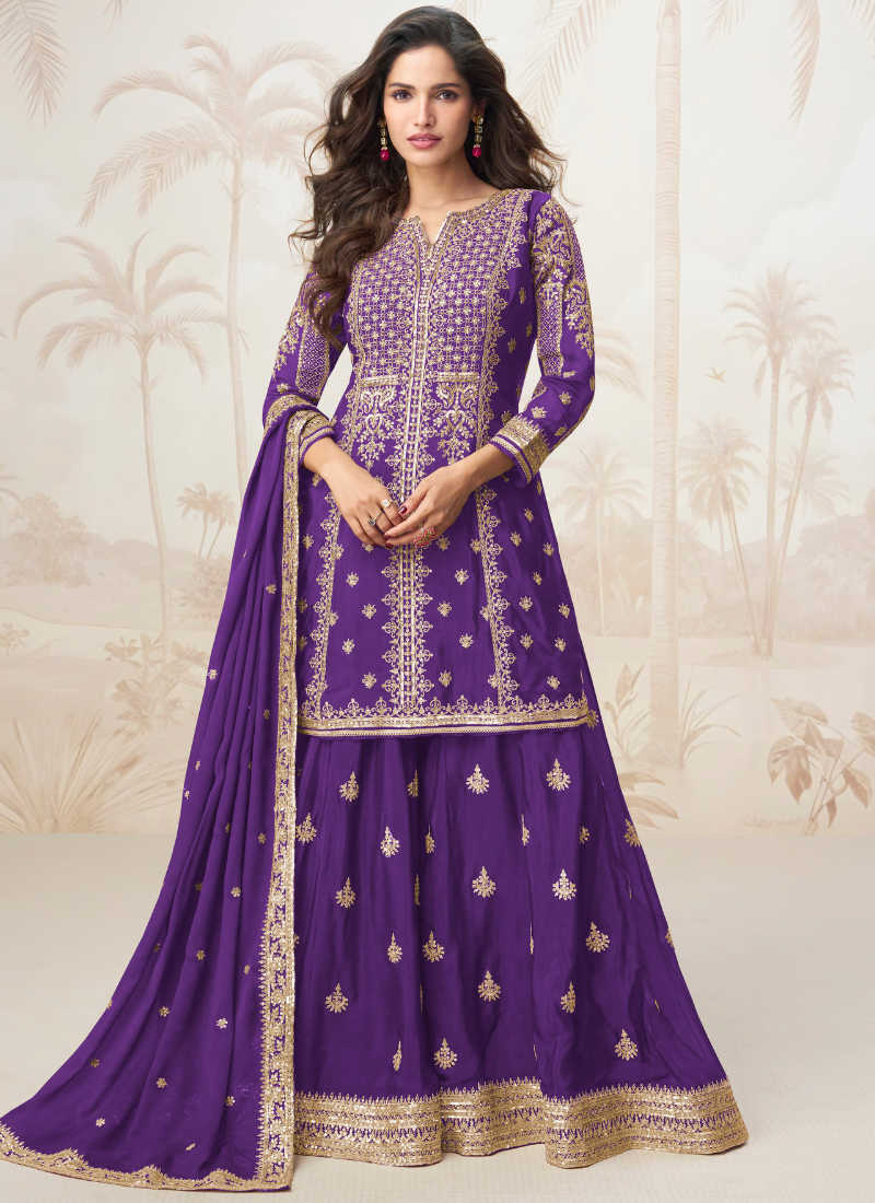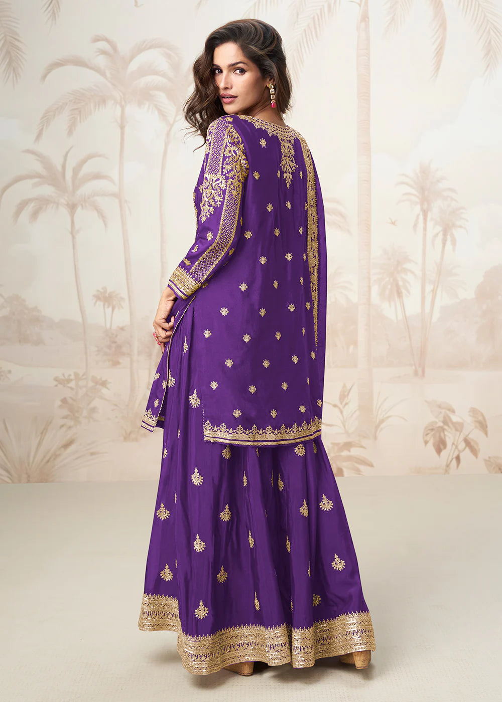 Purple Chinon Silk Embroidered Sharara Suit with Dupatta – Indian Pakistani Festival Outfit