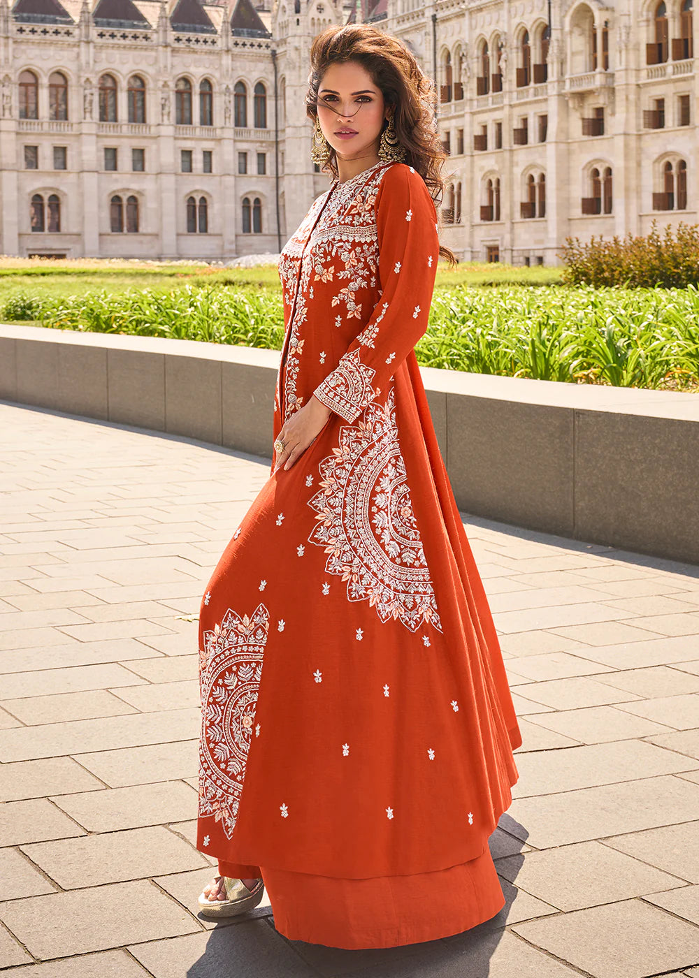 Rust Orange Organza Silk Slit Kurta With Palazzo Set for Indian Wedding and Pakistani Festival