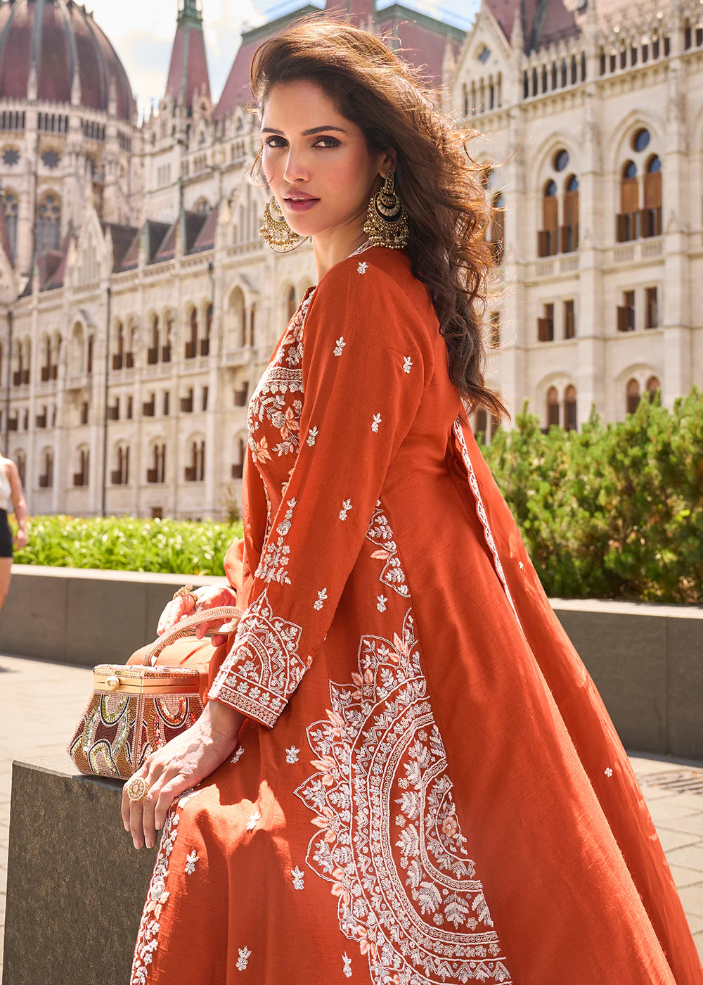Shop Bindyaa’s rust orange Organza Silk Anarkali suit, designed for Indian, Pakistani, and Punjabi festive and wedding wear. Featuring intricate white thread embroidery throughout, this full-length flared suit comes with matching pants and a soft organza dupatta. Perfect for Diwali, receptions, and cultural celebrations.