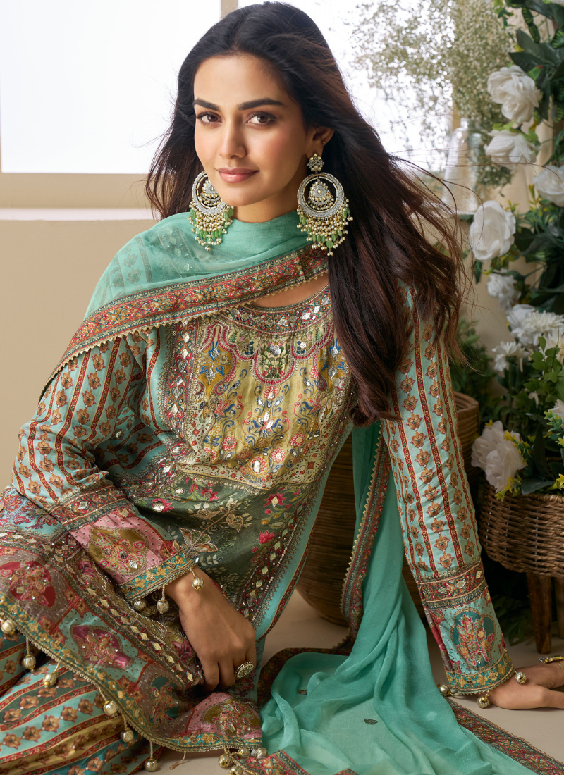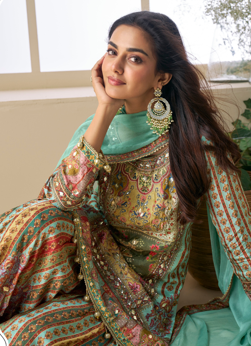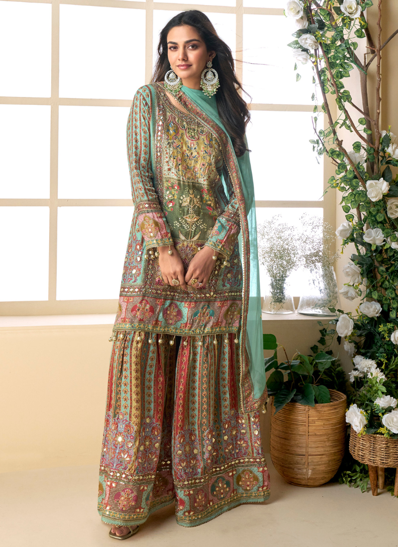 Teal Multicolor Viscose Crepe Silk Embroidered Sharara Suit with Zari & Gota Patti