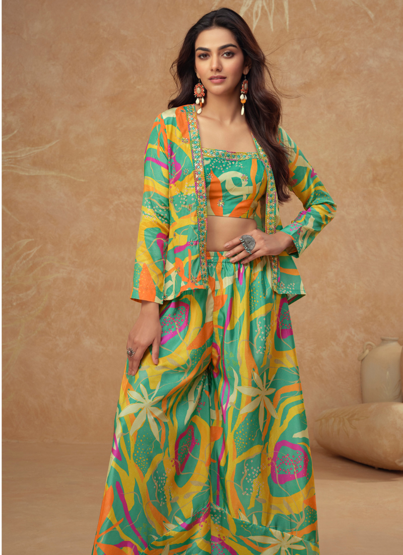 Tropical Multi-Color Chinon Silk Palazzo Set with Crop Top & Shrug